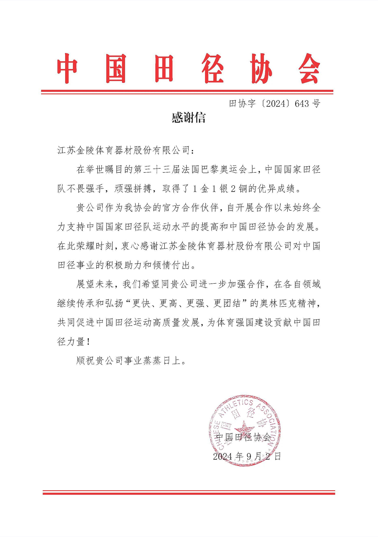 近日,中国田径协会向金陵体育发来感谢信,感谢金陵体育为中国国家田径队奥运争光做出的贡献。
